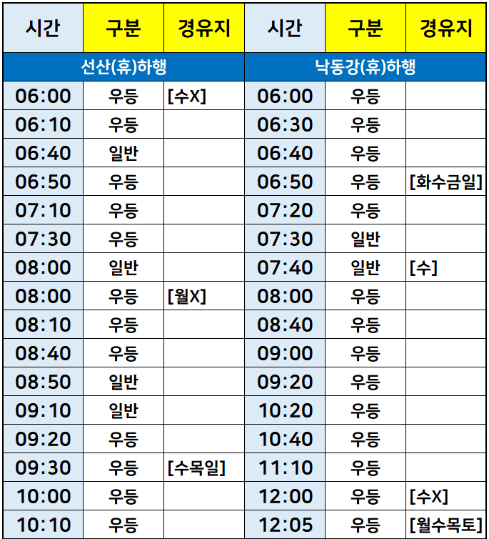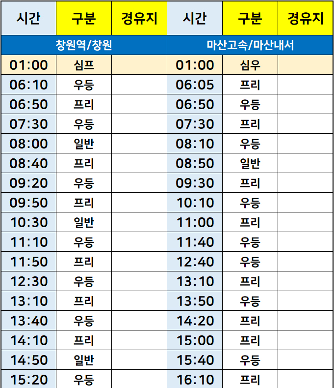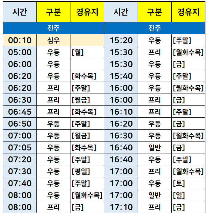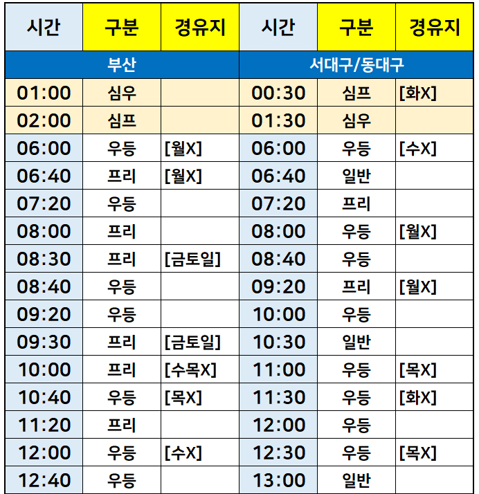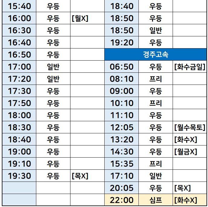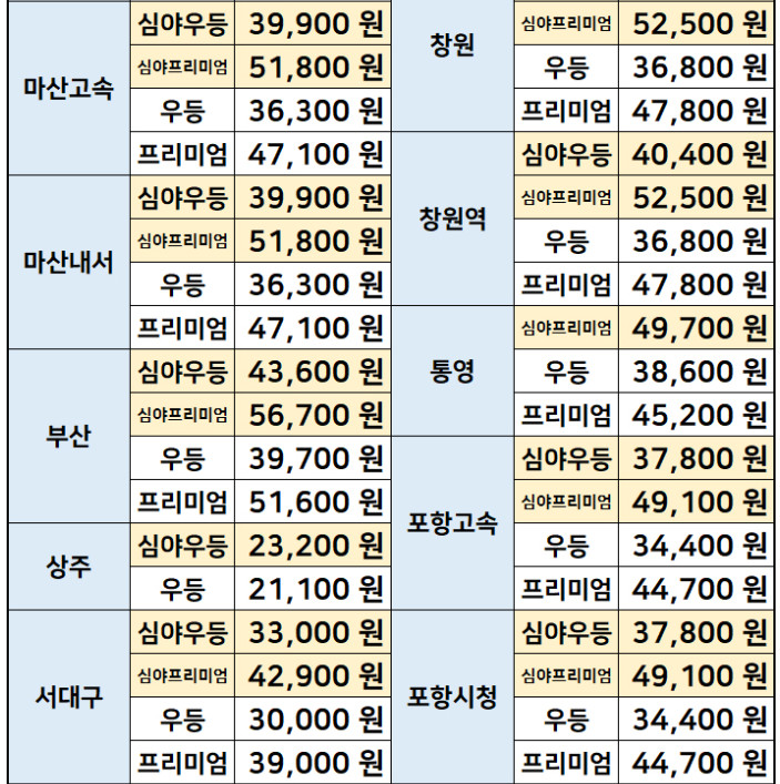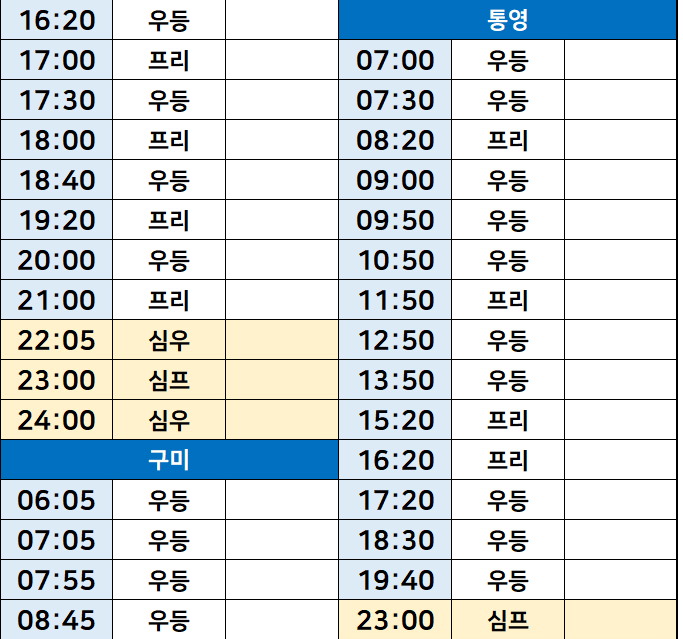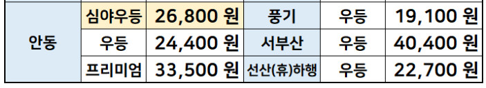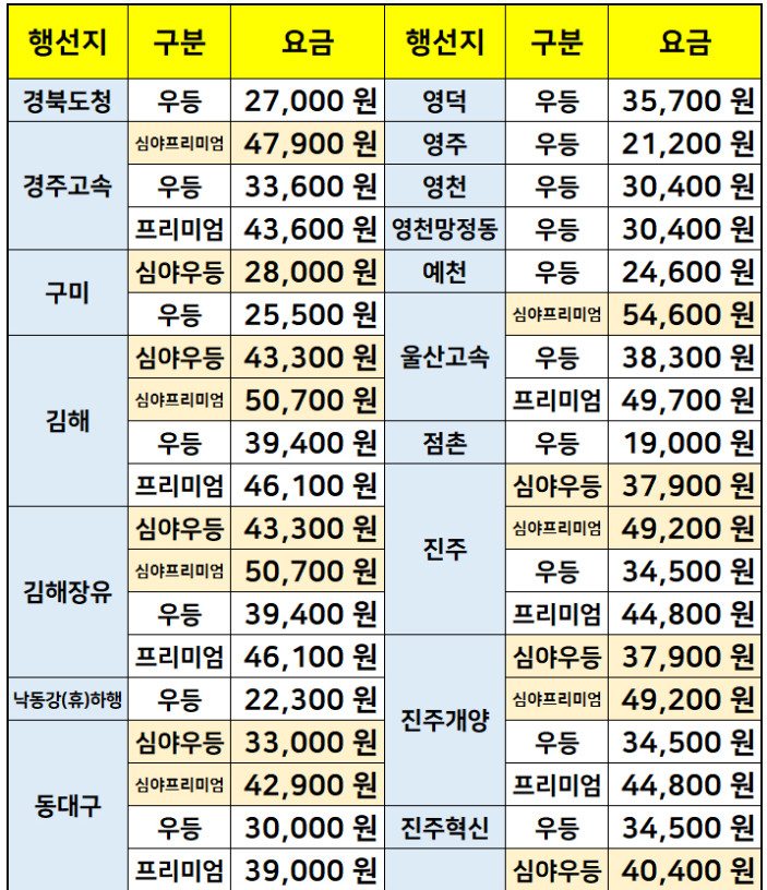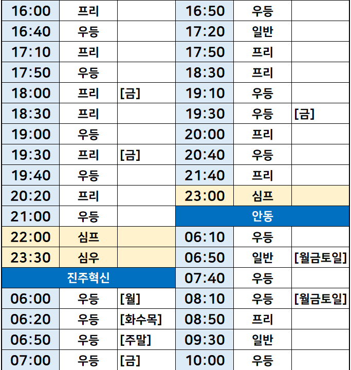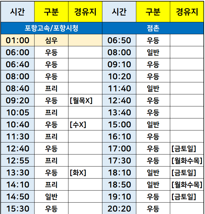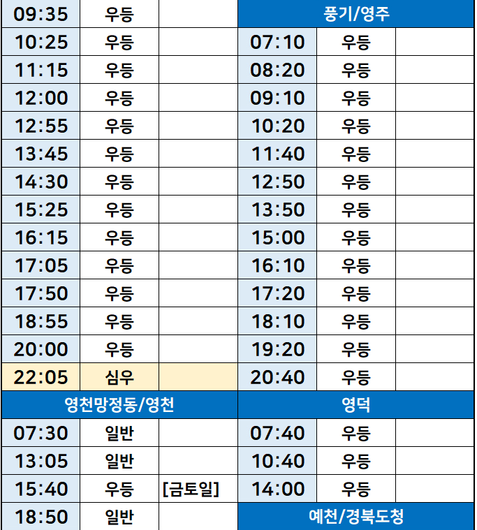 서울->포항, 점촌, 구미, 통영, 풍기, 영덕, 영천, 서부산, 예천
