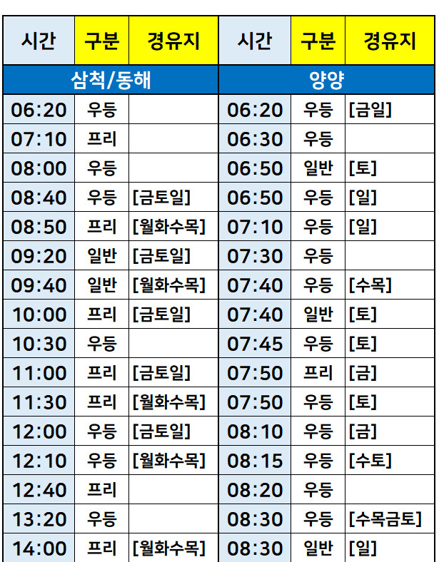 서울 -> 강원도 삼척, 동해, 양양, 춘천, 원주혁신