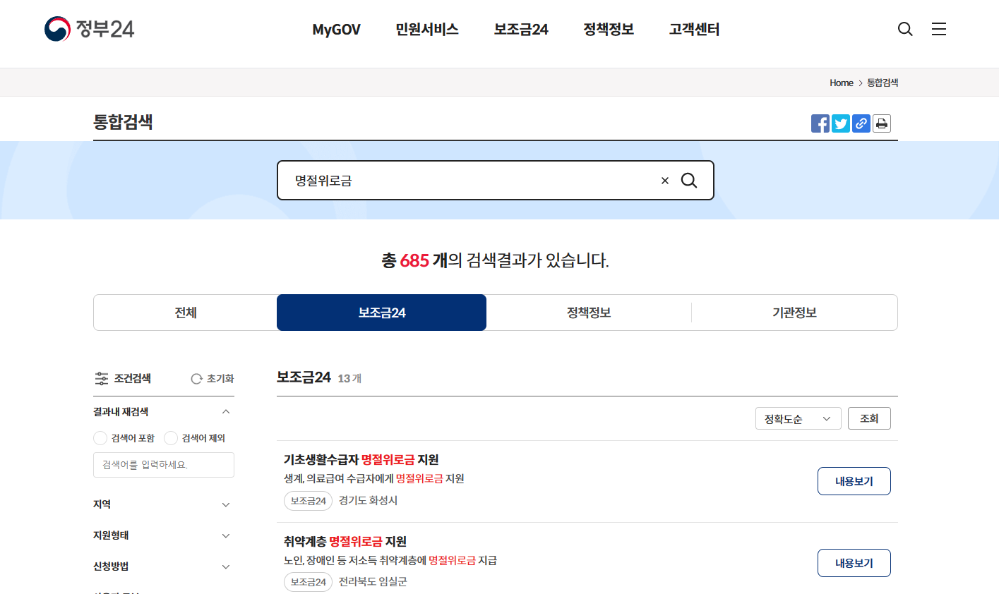 4. 좌측 지역별 검색을 하시거나 보조금24에서 바로 찾아보실 수 있으며 우측 내용보기 클릭하시면 지원대상 및 지원내용 기타 신청방법 등 자세한 안내사항을 살펴보실 수 있습니다.