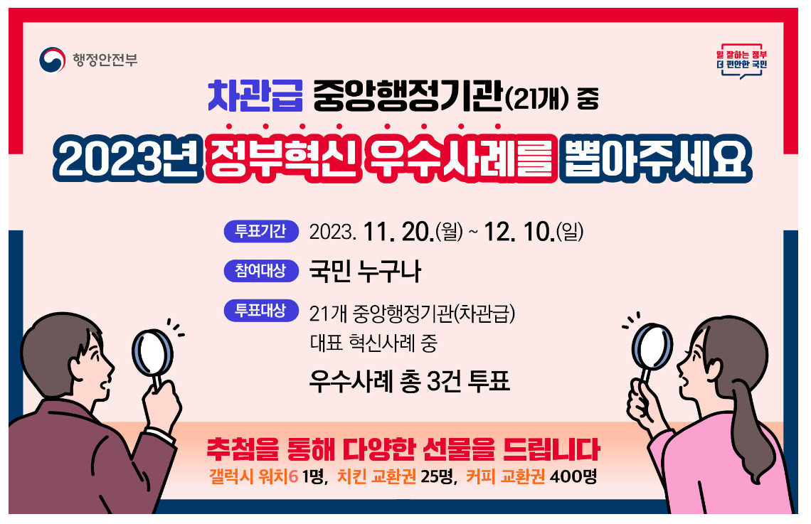 ○ 투표대상 : 21개 중앙행정기관(차관급) 대표 혁신사례 중 우수사례 총 3건 투표
