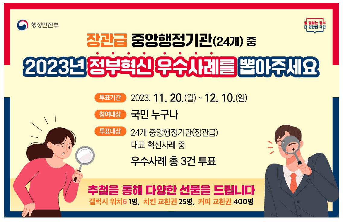 장관급 중앙행정기관(24개)의 대표 혁신사례 중 국민생활에 실제 도움이 되었고, 그 성과를 느낄 수 있었던 사례를 여러분들이 직접 투표로